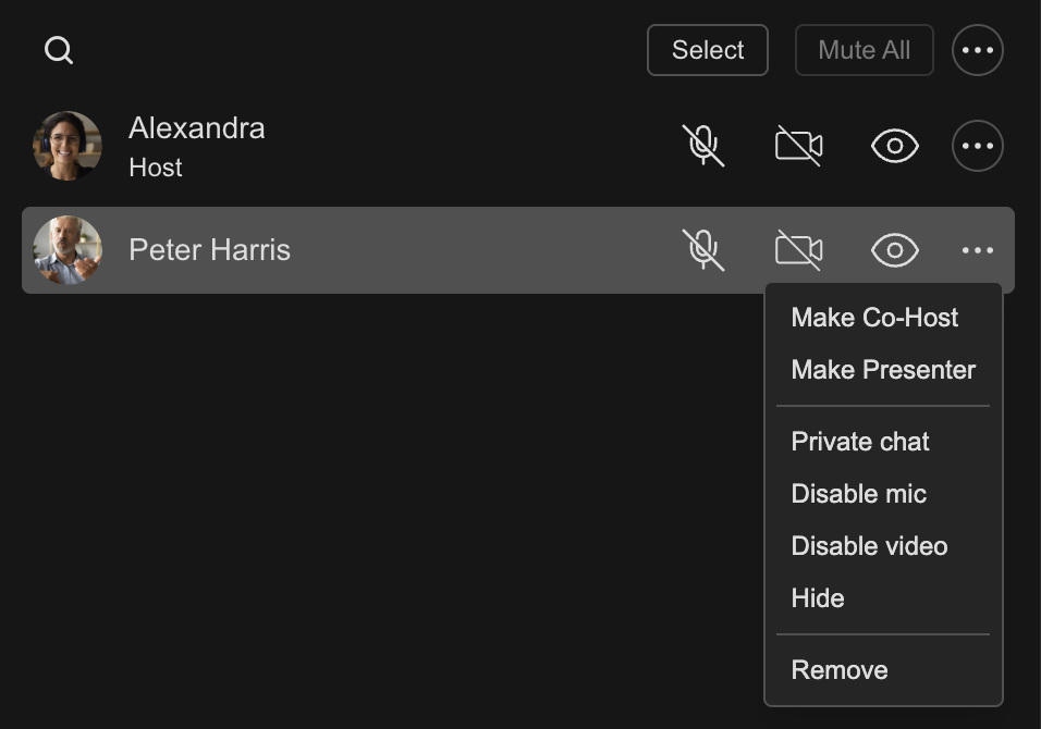 Within the Participants tab, there are two ways to access the Participant Management Menu. It provides a myriad of options for the Host to change individual or multiple participants’ permissions, tile features, and more.