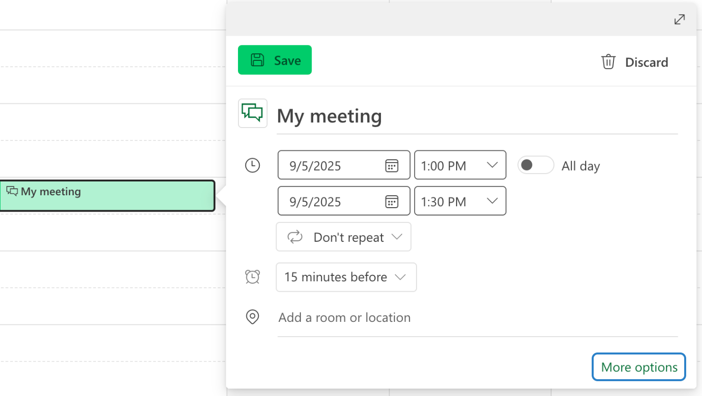 Open your Outlook Calendar and create a new event (or open an existing one).