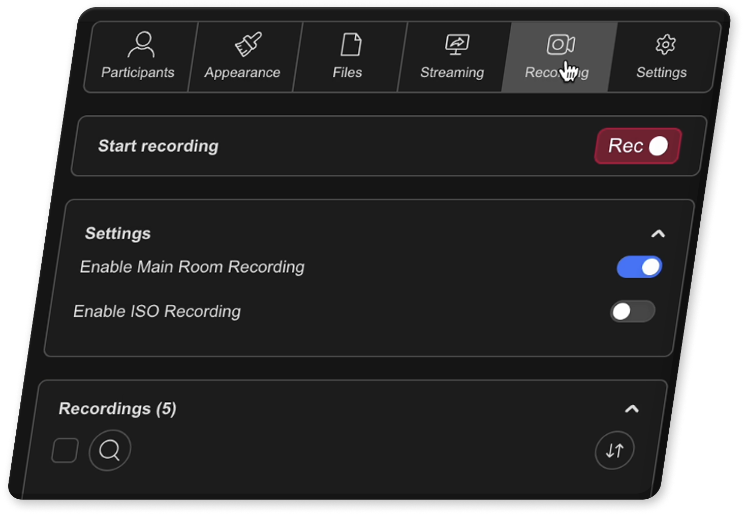 The Recording tab in the Control Panel lets hosts record sessions directly from the room. You can choose how to capture the session, start and stop recording with a single button, and access completed files from the same tab.
